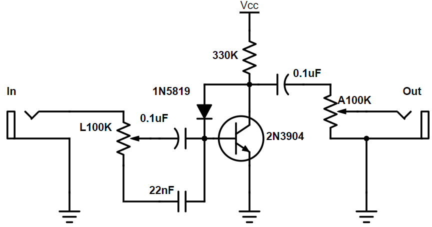 This is a variation on the ubiquitous Bazz Fuss circuit that I made into a pedal. The name is a for a special friend. It has Butter (Thickness) and Level controls. The transistor is a 2N3904 NPN BJT. The diode is 1N5819. This circuit is based on the standard Bazz Fuss with a "self-biasing" diode for biasing the transistor, rather than the standard voltage divider network. |