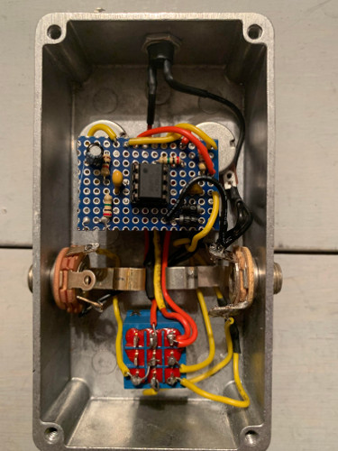 This is an overdrive/fuzz pedal built with just a few components. Very similar to the crucialDistortion pedal, but with a couple added diodes for fuzz. It has Level and Drive controls. Opamp is Lm741. Diodes are N4001. Here's a gut shot. It's a little bit messy, don't judge .. |